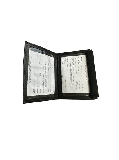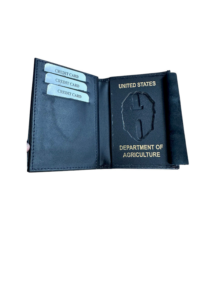 3 CREDIT CARD SLOTS, SLOT FOR MONEY, 2 ID HOLDER W/ FELT PROTECTOR AND BADGE CUT W/ PROTECTIVE FELT HOLDER.