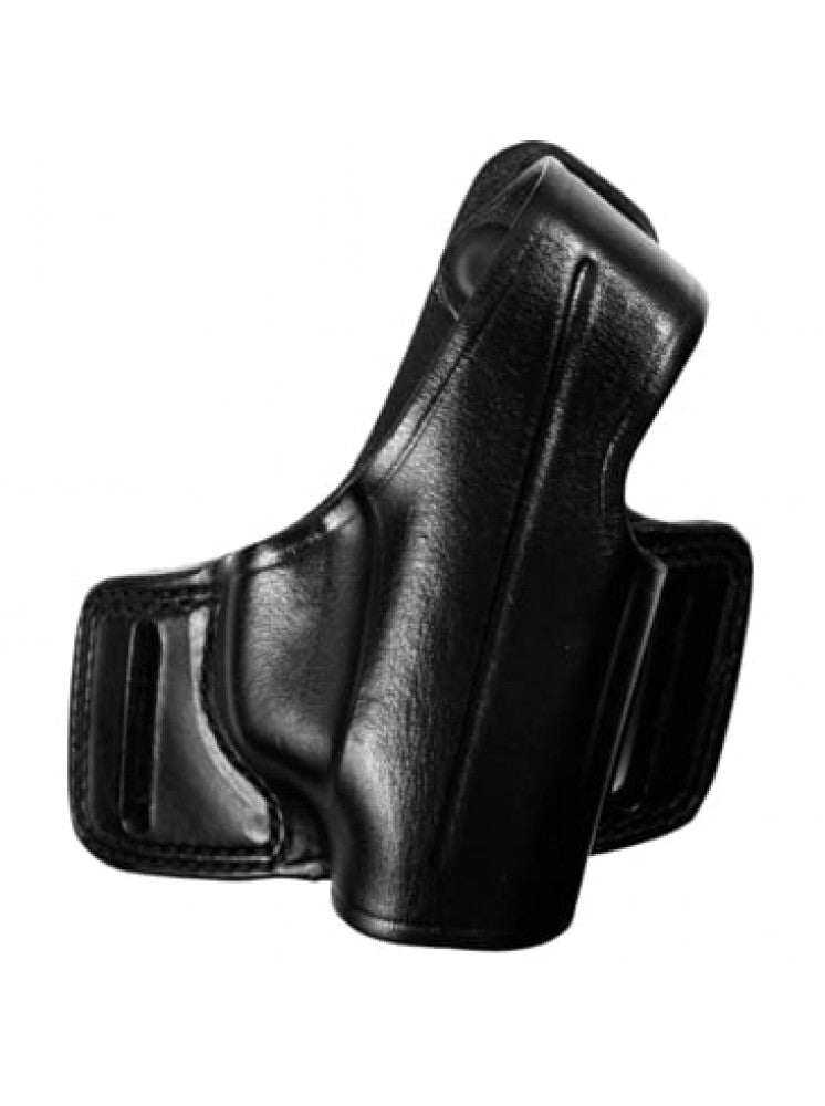 Tried and true, this compact Bianchi Black Widow holster features an open muzzle design, and widely spaced belt slots to pull the gun close to the body and high on the hip for excellent concealability. Thumb break secures gun in the holster. Constructed of genuine leather. Available in tan or black. Fits belts up to 1.75" wide.