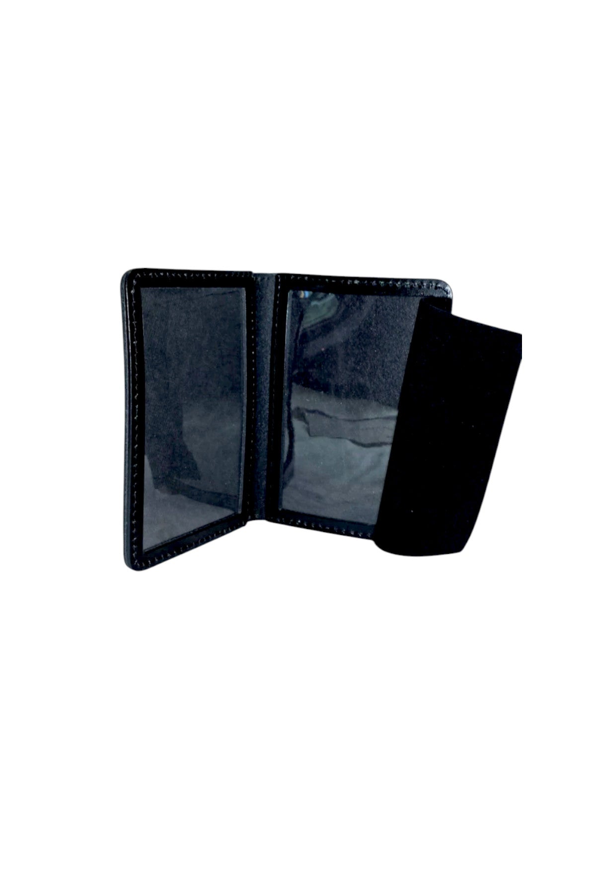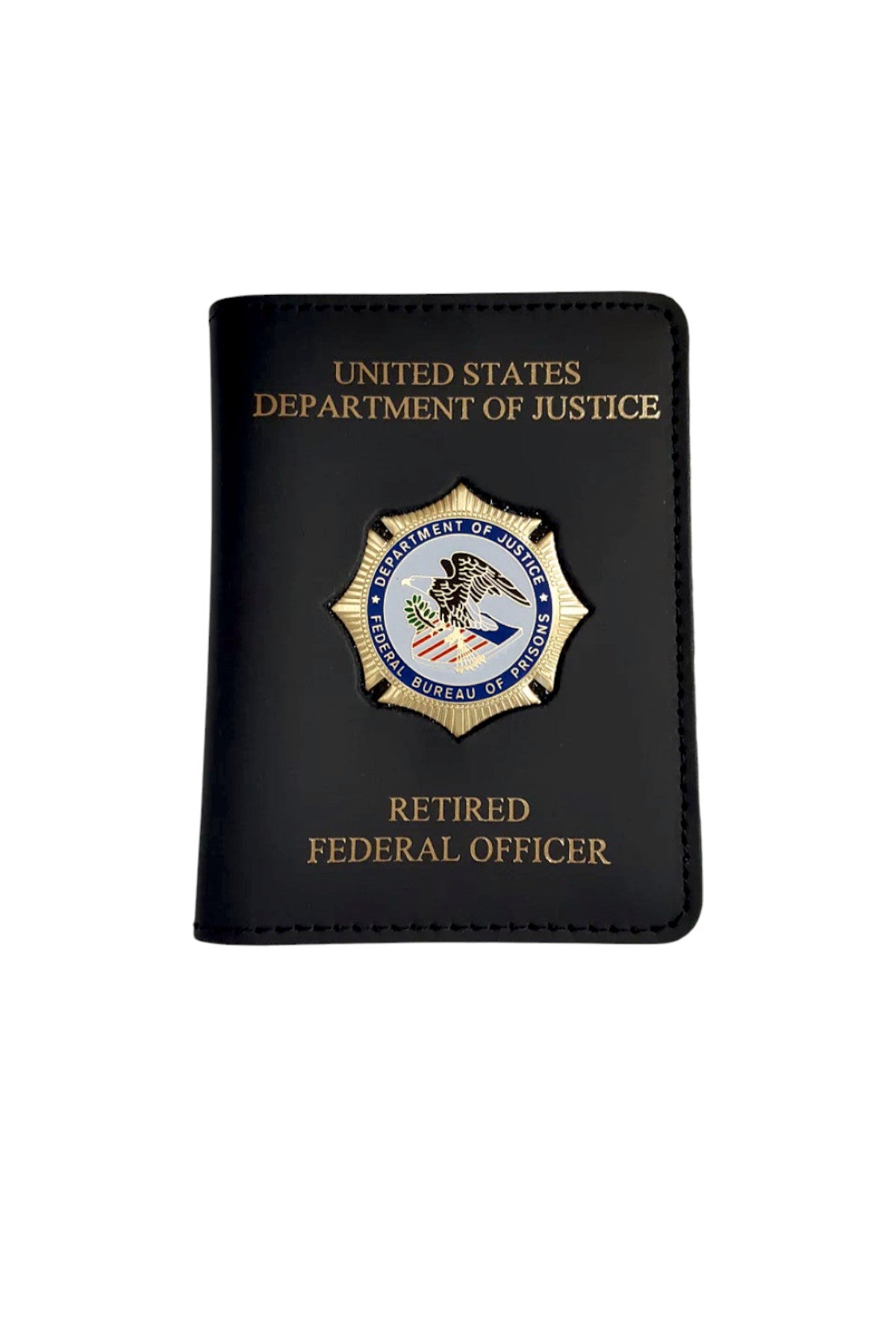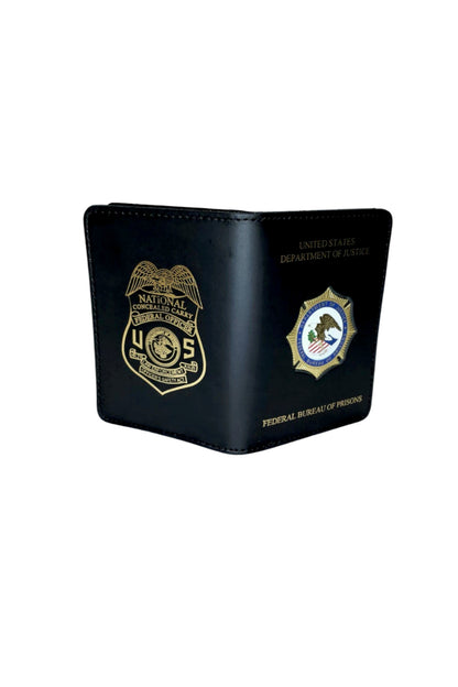 LEATHER 2 WINDOW CREDENTIAL CASE. ID SIZE 3 X 4.5" FRONT: BOP BADGE AND RETIRED FEDERAL OFFICER, BACK LEOSA BADGE IN GOLD IMPRINT, FELT BETWEEN WINDOWS.