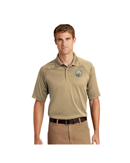 CORNERSTONE TAN TACTICAL POLO SHIRT WITH OD GREEN BOP BADGE EMBROIDERED ON FRONT LEFT.