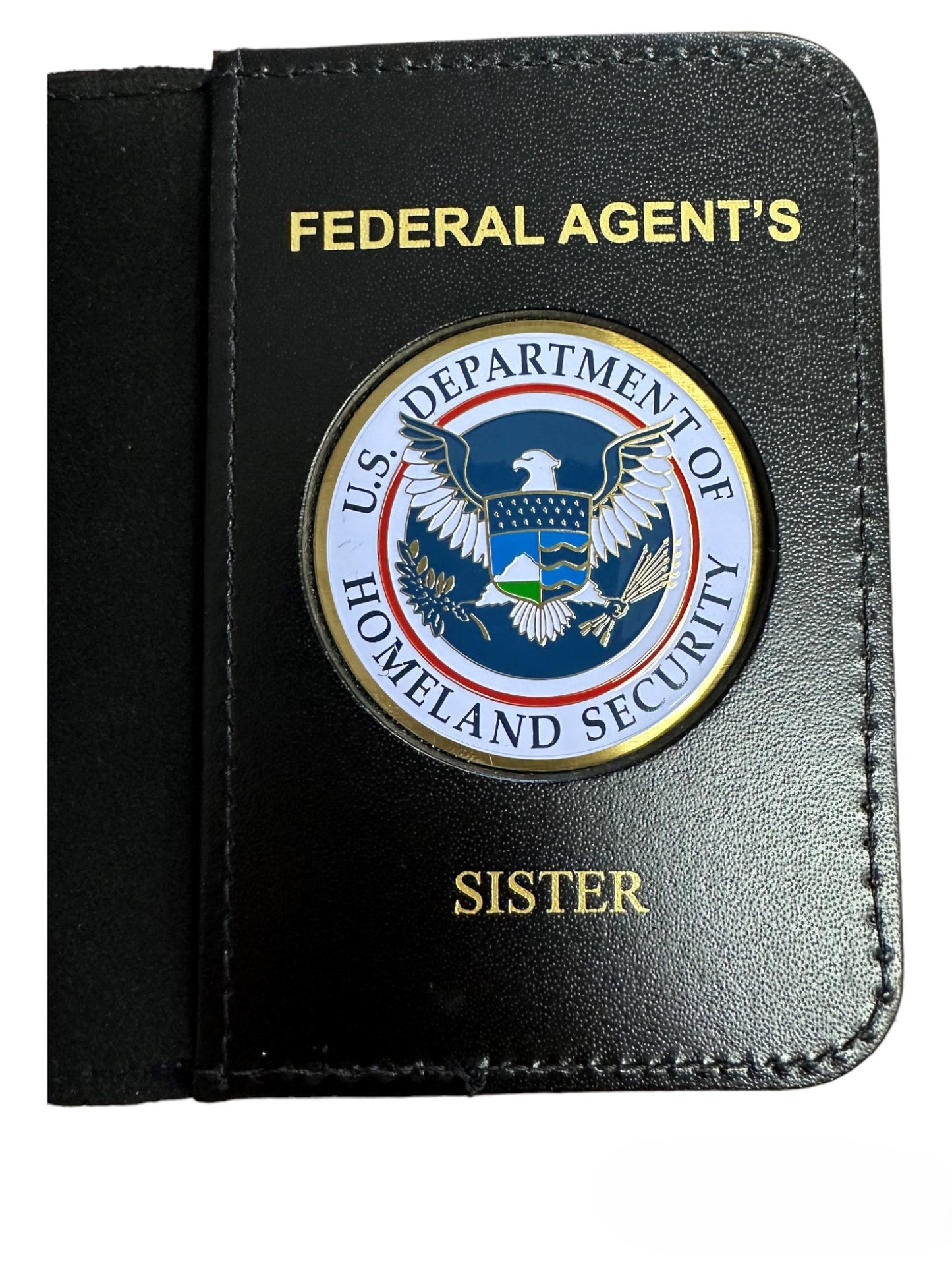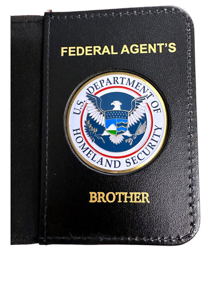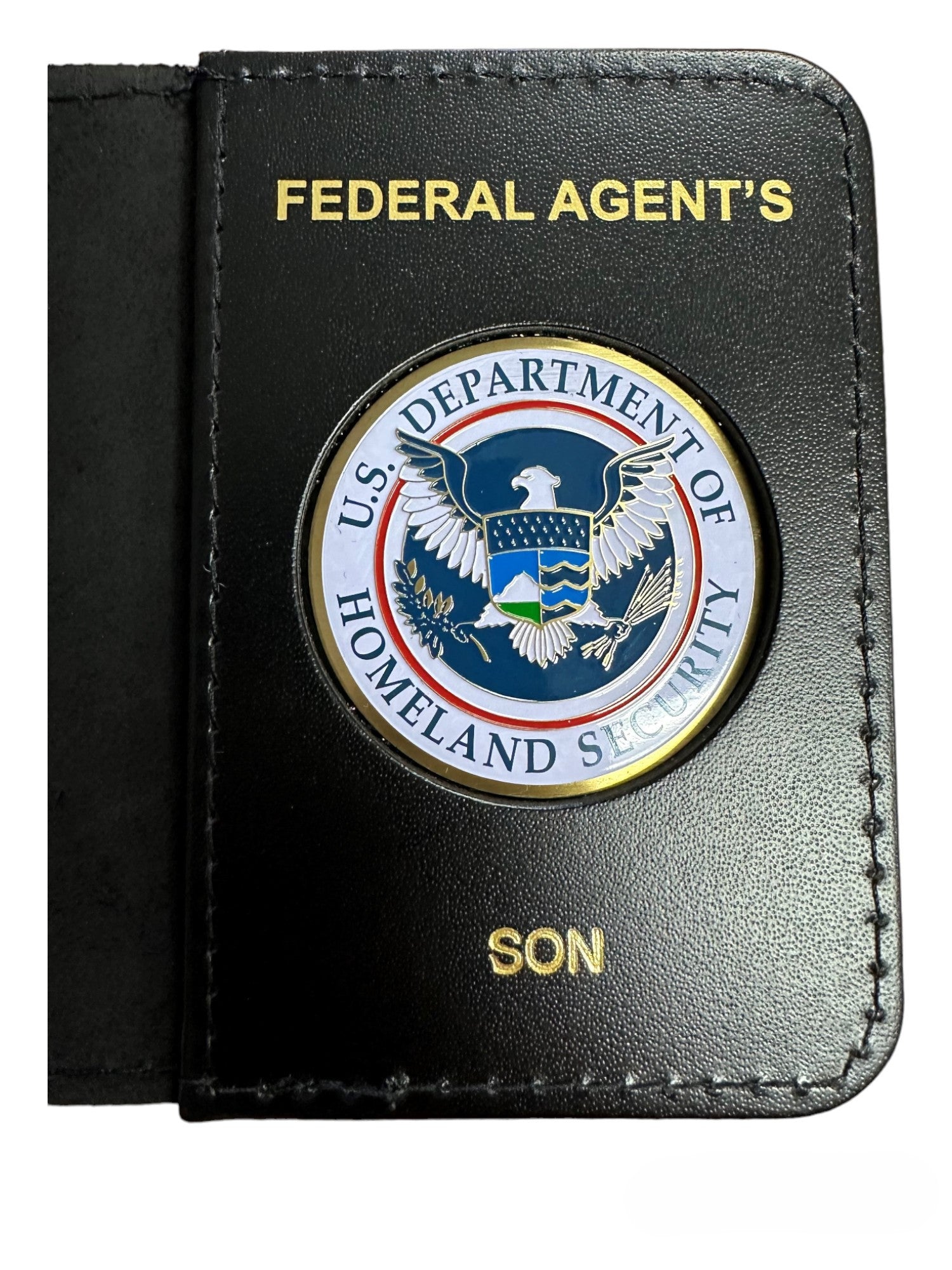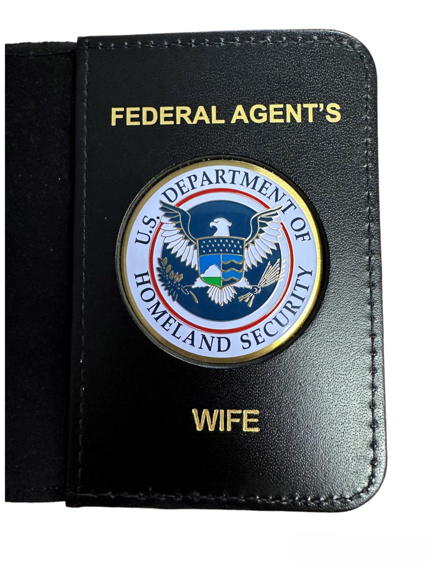 MINI CREDENTIAL CASE WITH DHS SEAL MEDALLION INSIDE. CREDENTIAL SIZE 4 3/4" X 3", WINDOW SIZE 2.63" X 4". CHOOSE IMPRINTING: FEDERAL AGENT'S WIFE, HUSBAND, SISTER, BROTHER, DAUGHTER, SON OR FAMILY