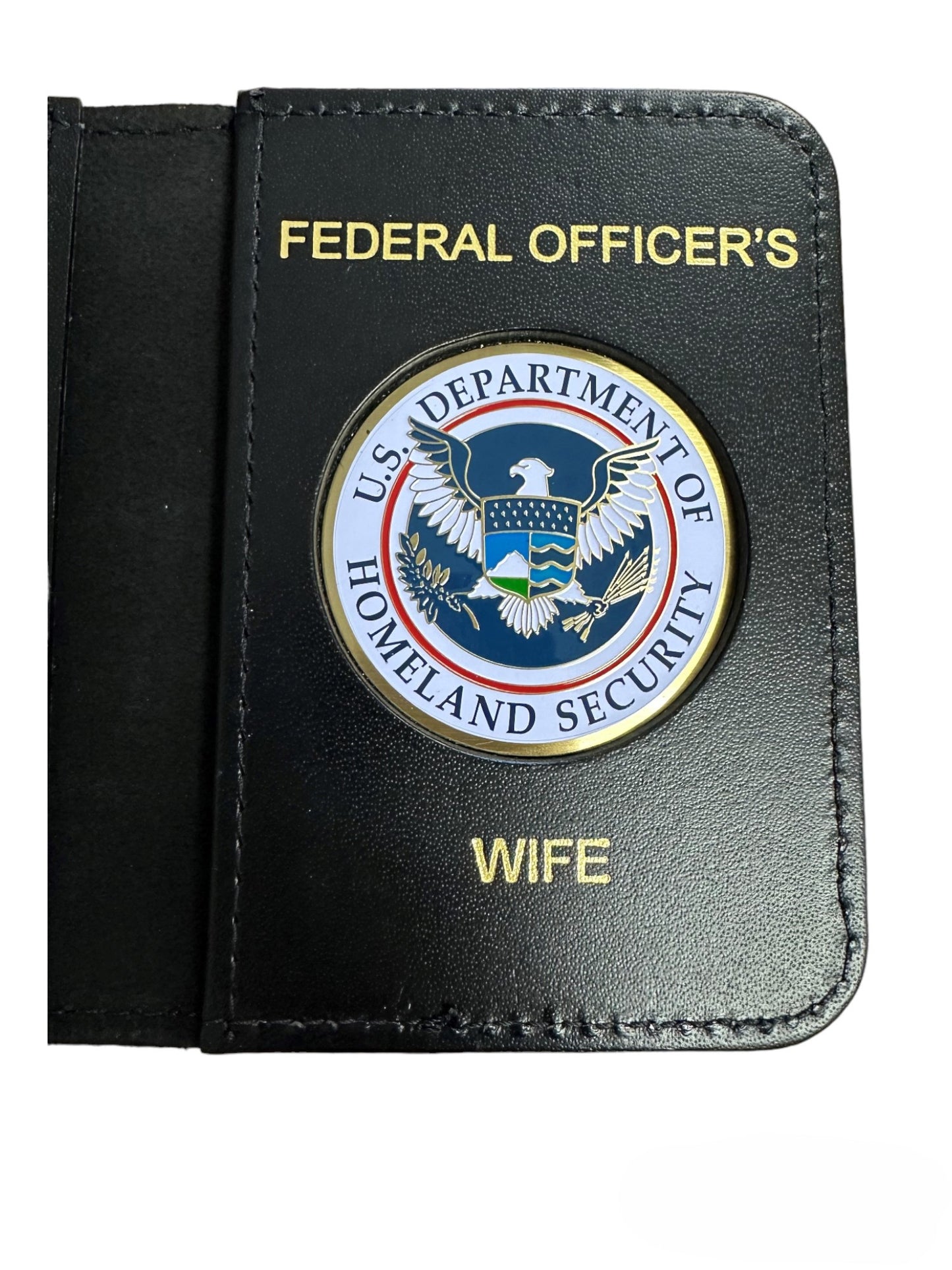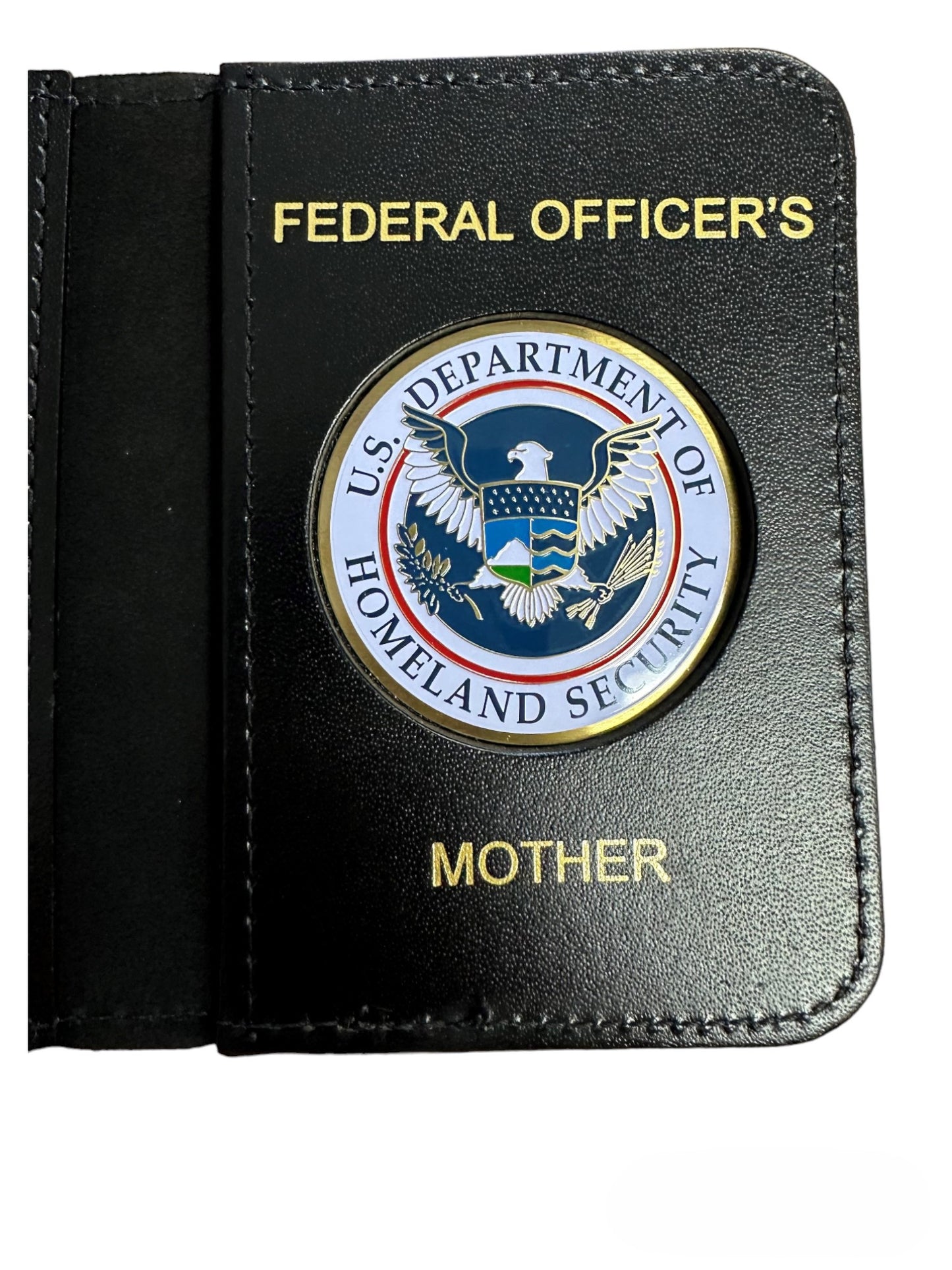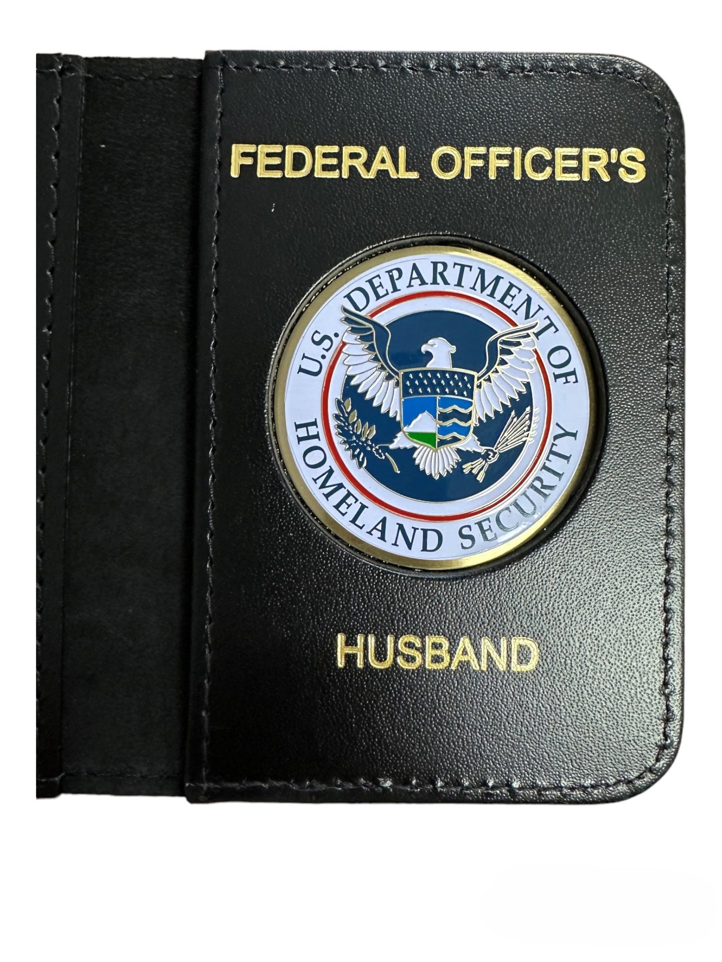 MINI CREDENTIAL CASE WITH DHS SEAL MEDALLION INSIDE. CREDENTIAL SIZE 4 3/4" X 3", WINDOW SIZE 2.63" X 4". CHOOSE IMPRINTING: FEDERAL OFFICER'S WIFE, HUSBAND, SISTER, BROTHER, DAUGHTER, SON OR FAMILY
