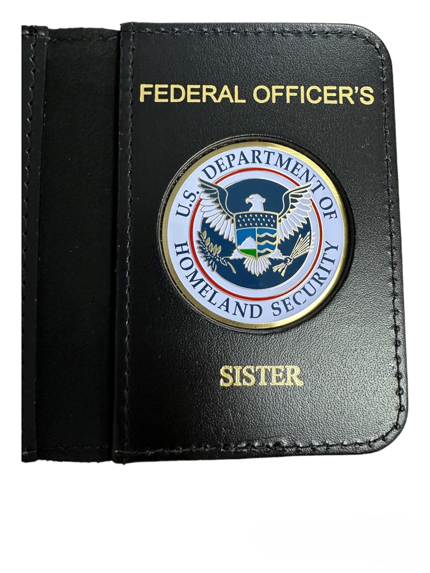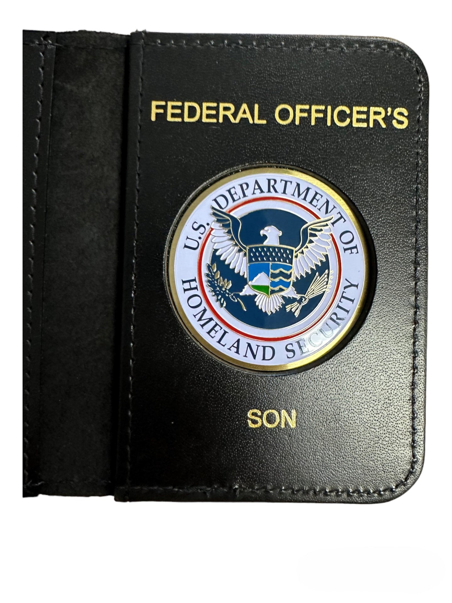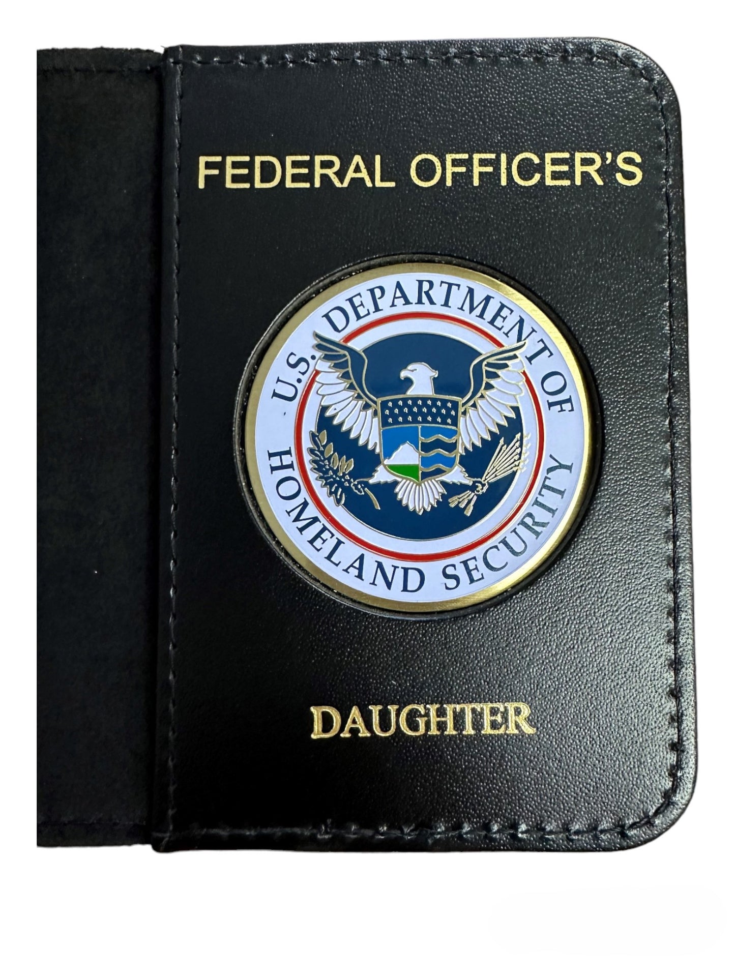 MINI CREDENTIAL CASE WITH DHS SEAL MEDALLION INSIDE. CREDENTIAL SIZE 4 3/4" X 3", WINDOW SIZE 2.63" X 4". CHOOSE IMPRINTING: FEDERAL OFFICER'S WIFE, HUSBAND, SISTER, BROTHER, DAUGHTER, SON OR FAMILY