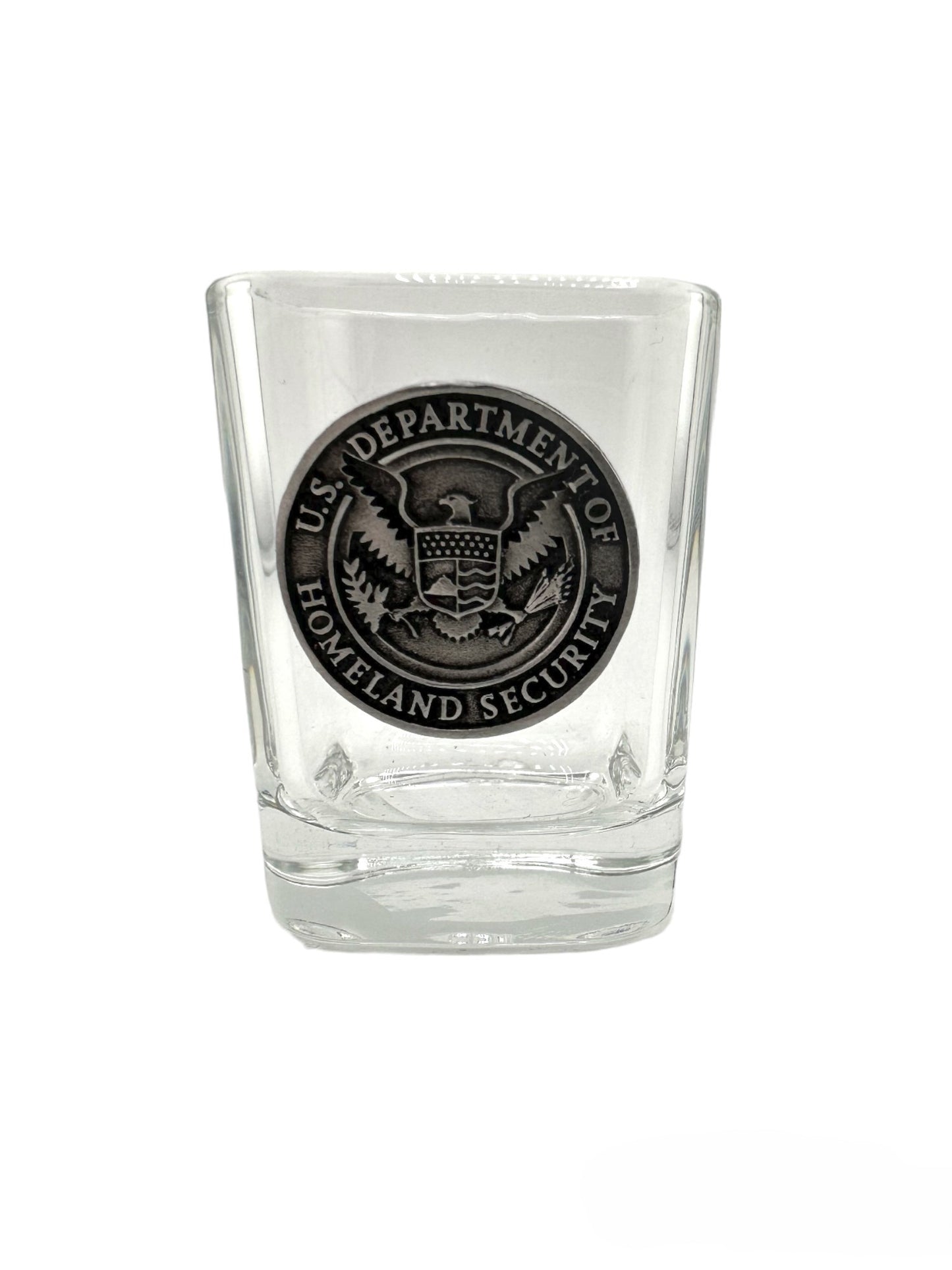 DHS SQUARE SHOT GLASS WITH PEWTER BADGE