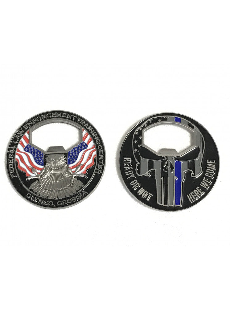Introducing our new FLETC "Ready or Not" bottle opener coin! On one side, proudly display the eagle with the USA flag and Federal Law Enforcement Training Center details. On the other side, the Punisher skull with a blue line and "Ready or Not Here We Come" are featured. Plus, the top of the coin doubles as a bottle opener. Show your support and be prepared with this versatile coin.