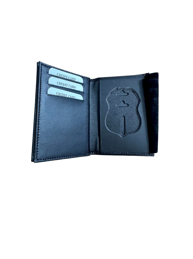 WALLET STYLE BADGE CASE. FITS THE FPS BADGE. HAS TWO WINDOWS FOR ID’S AND FELT BETWEEN WINDOWS. FEATURES 4 SLOTS FOR CREDIT CARDS AND FELT OVER BADGE FOR EXTRA PROTECTION. ALSO OPENS AS A WALLET TO CARRY MONEY.