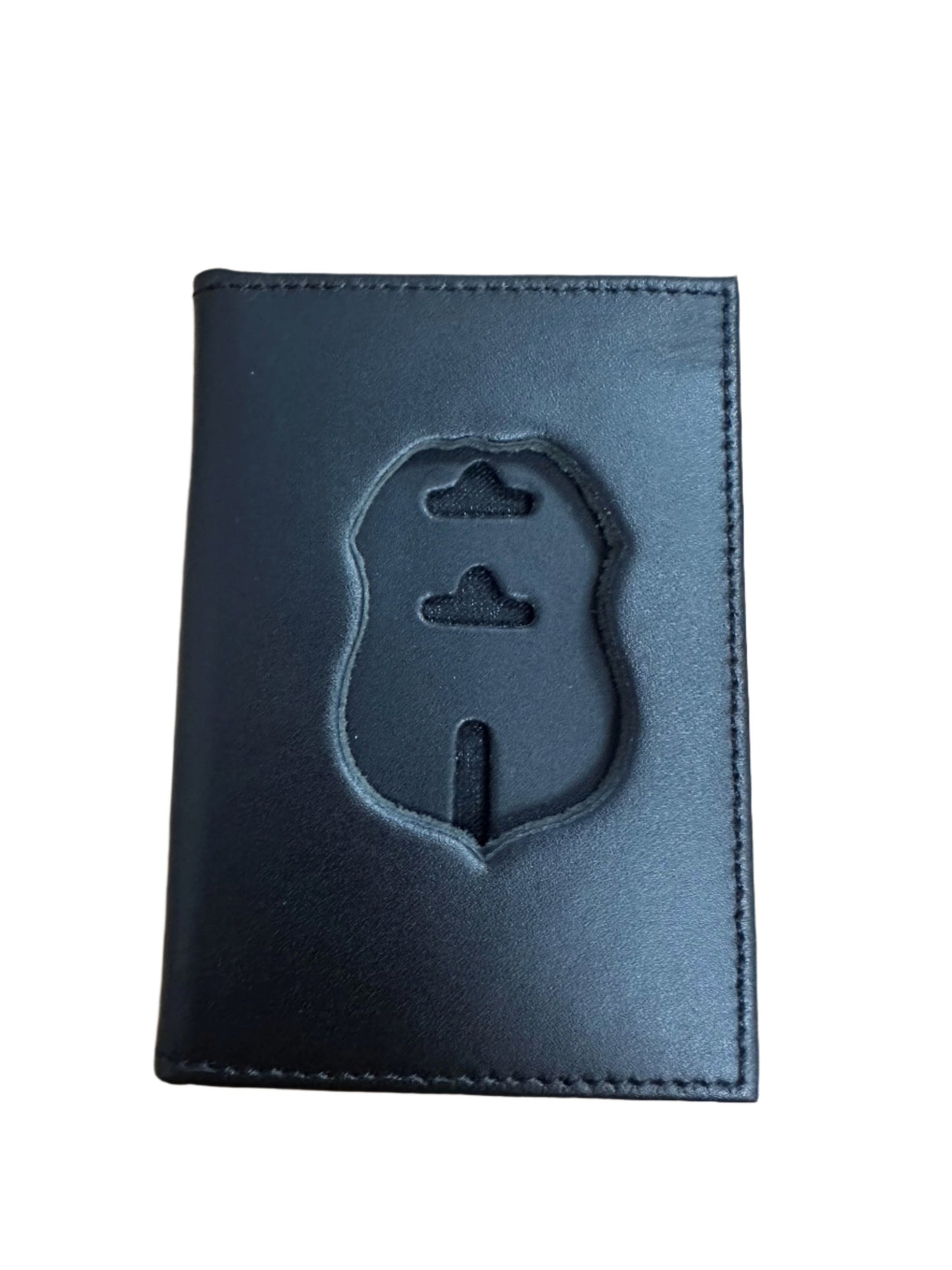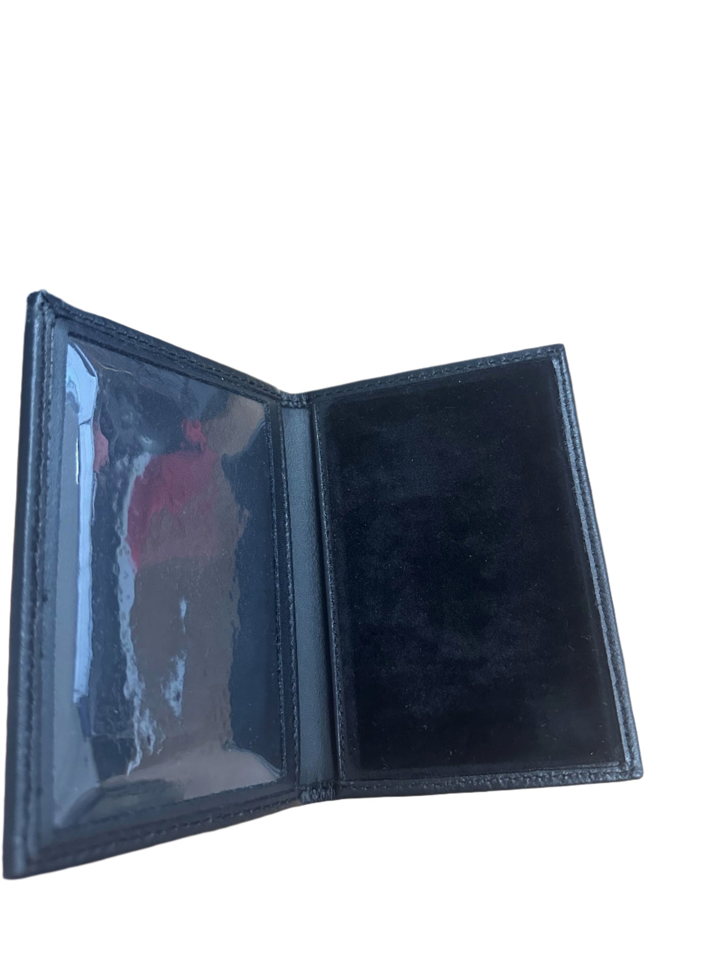 MADE BY STRONG LEATHER, CO. BADGE CUT IS ON THE OUTSIDE WITH TWO WINDOWS INSIDE AND FELT PROTECTION FOR THE WINDOWS 3x4 1/2".