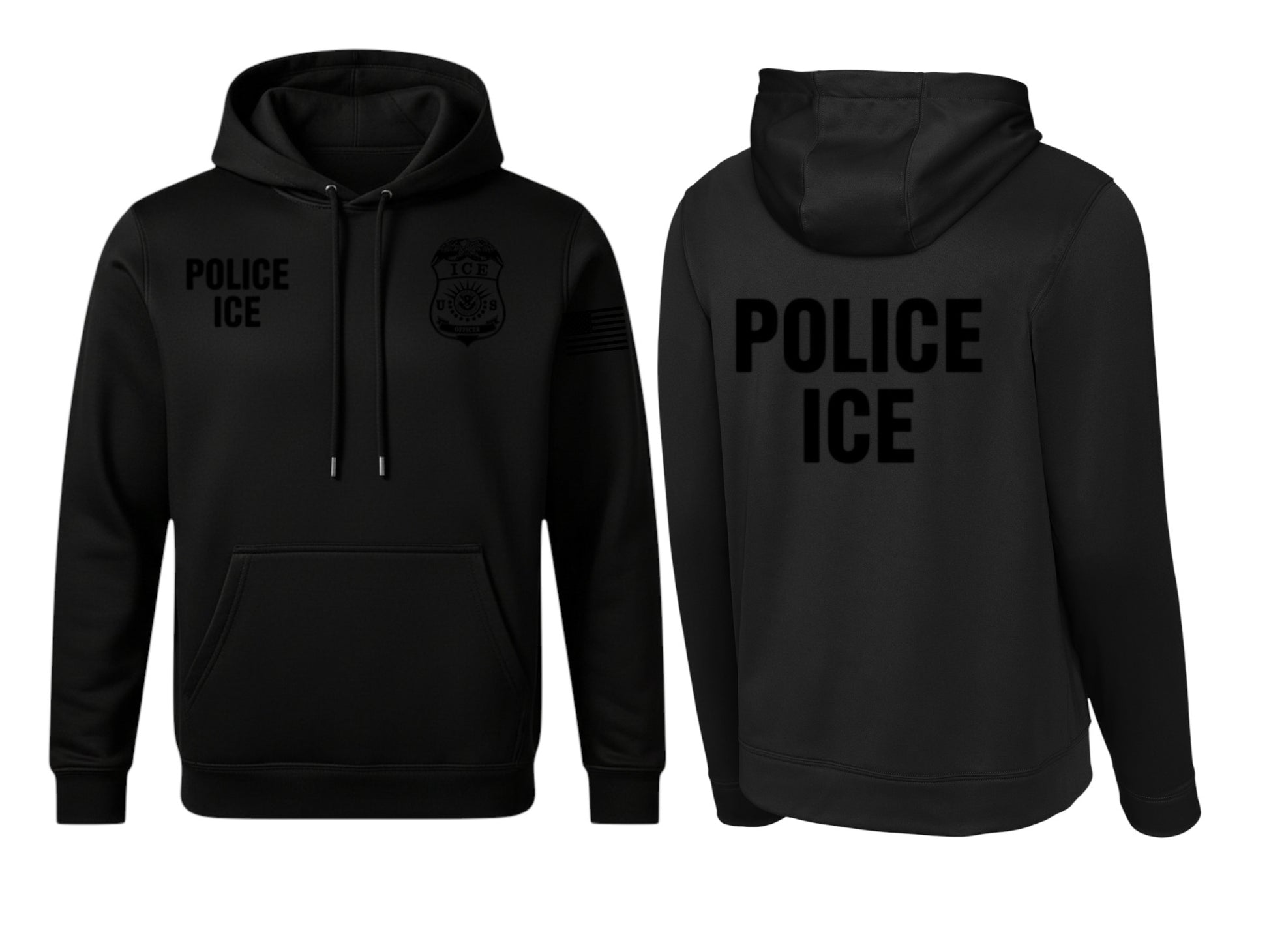 ICE OFFICER BADGE ON FRONT LEFT AND POLICE ICE RIGHT SIDE W/ POLICE ICE ON BACK.