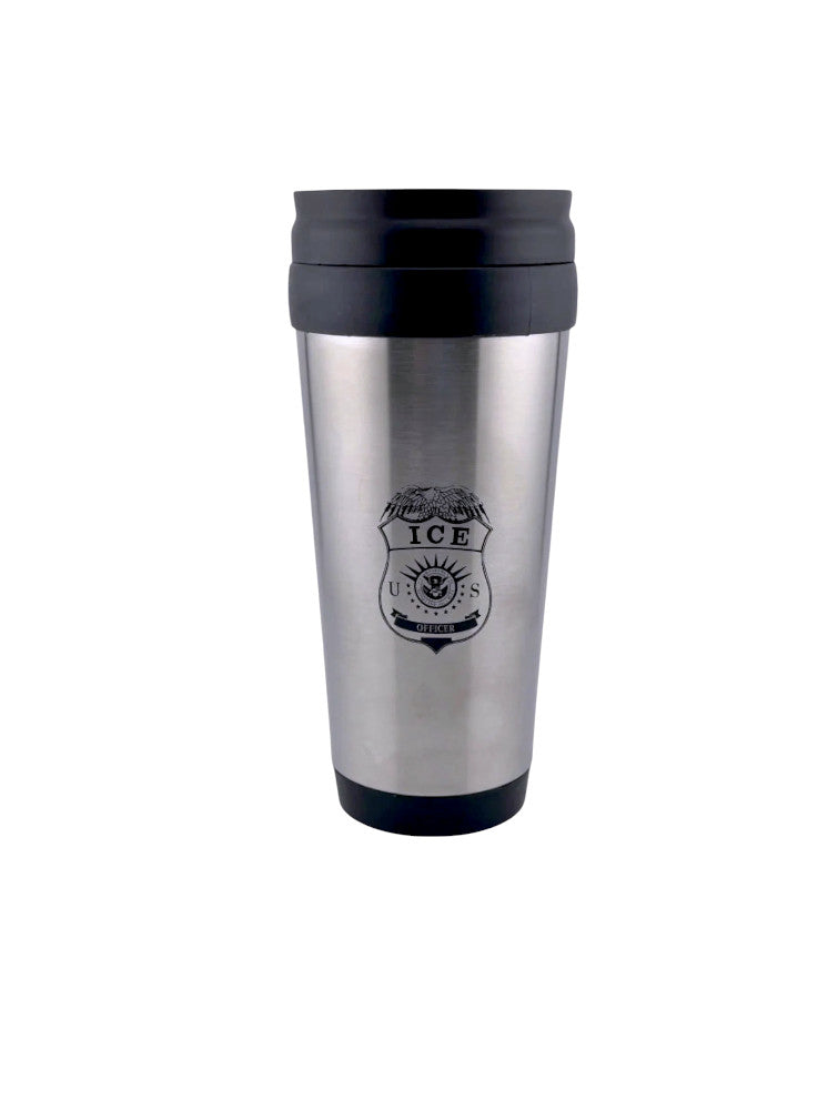 Stay cool on the go with our ICE STAINLESS STEEL TRAVEL MUG! This 16 oz mug features a secure screw top lid and a sleek design. The iconic ICE officer badge is printed in black on both sides, making it the perfect gift for any office occasion. And with its durable stainless steel construction, this mug is easy to clean and will keep your drinks cold for hours. Don't wait, get yours today!