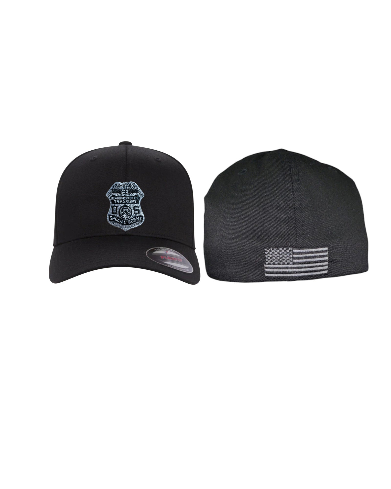 IRS CI GREY BADGE W/ FLAG BLACK FLEXFIT HAT