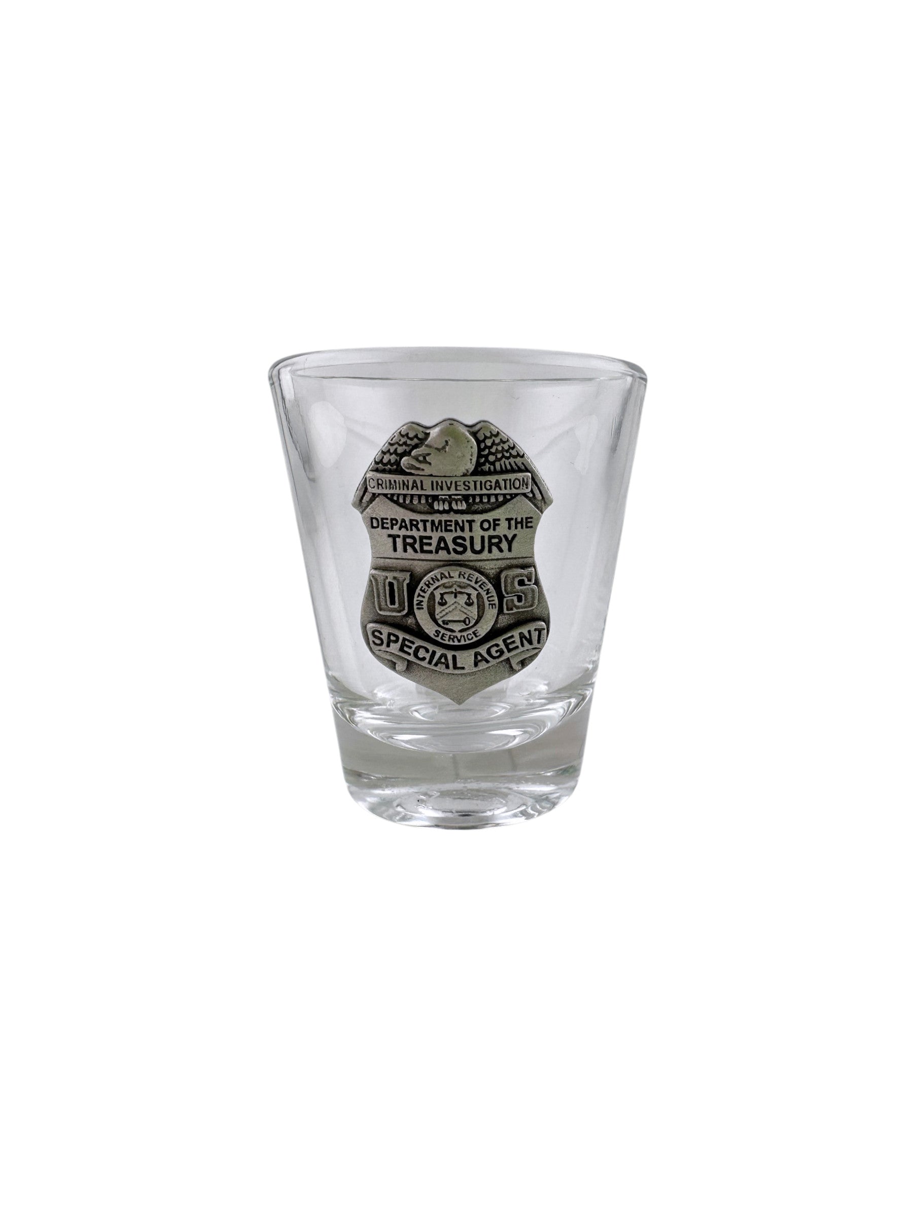 Introducing the IRS ROUND PEWTER SHOT GLASS - the perfect addition to any party or bar stock. This 2.25 oz shot glass is adorned with a pewter mount of the iconic IRS CI badge, making it a great giveaway for any event. Cheers to good times and great drinks with this stylish and durable shot glass.