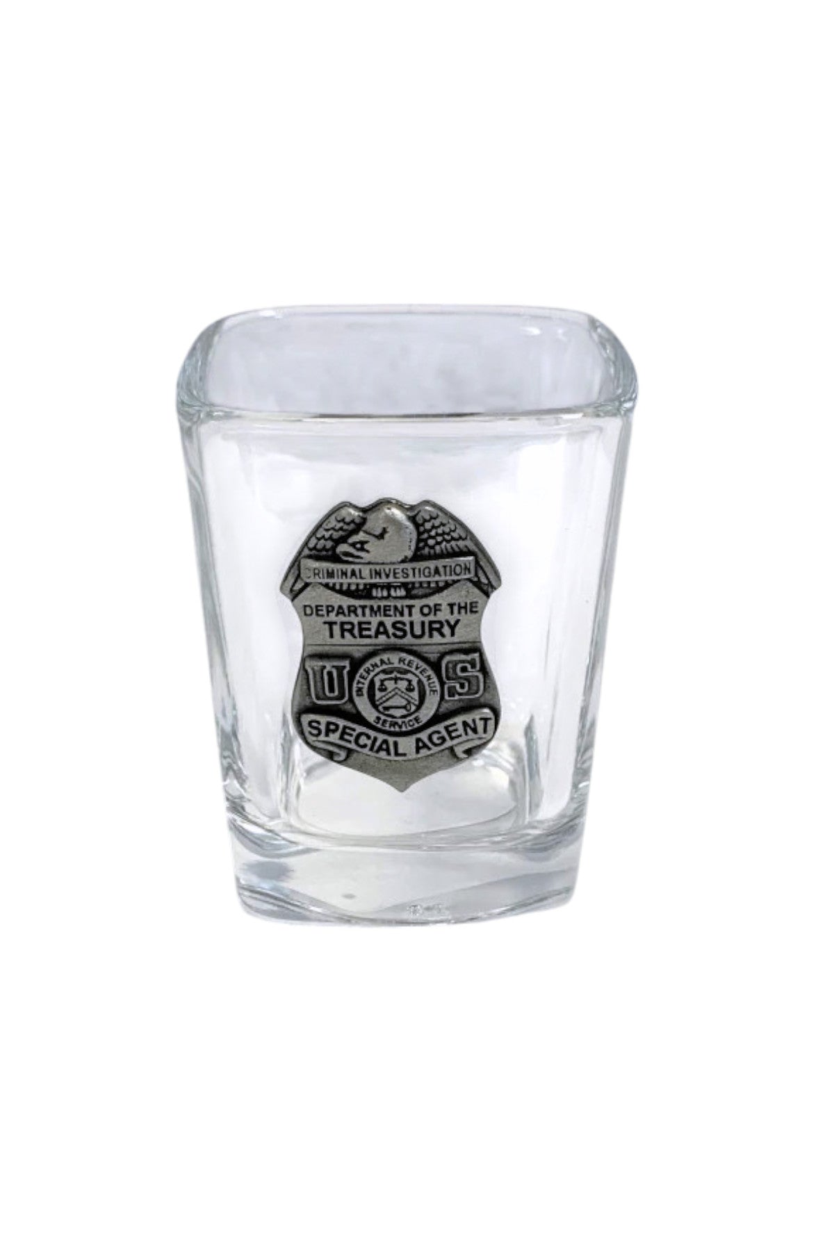Introducing the IRS SQUARE PEWTER SHOT GLASS - the perfect addition to any party or bar stock. This 2.25 oz shot glass is adorned with a pewter mount of the iconic IRS CI badge, making it a great giveaway for any event. Cheers to good times and great drinks with this stylish and durable shot glass.