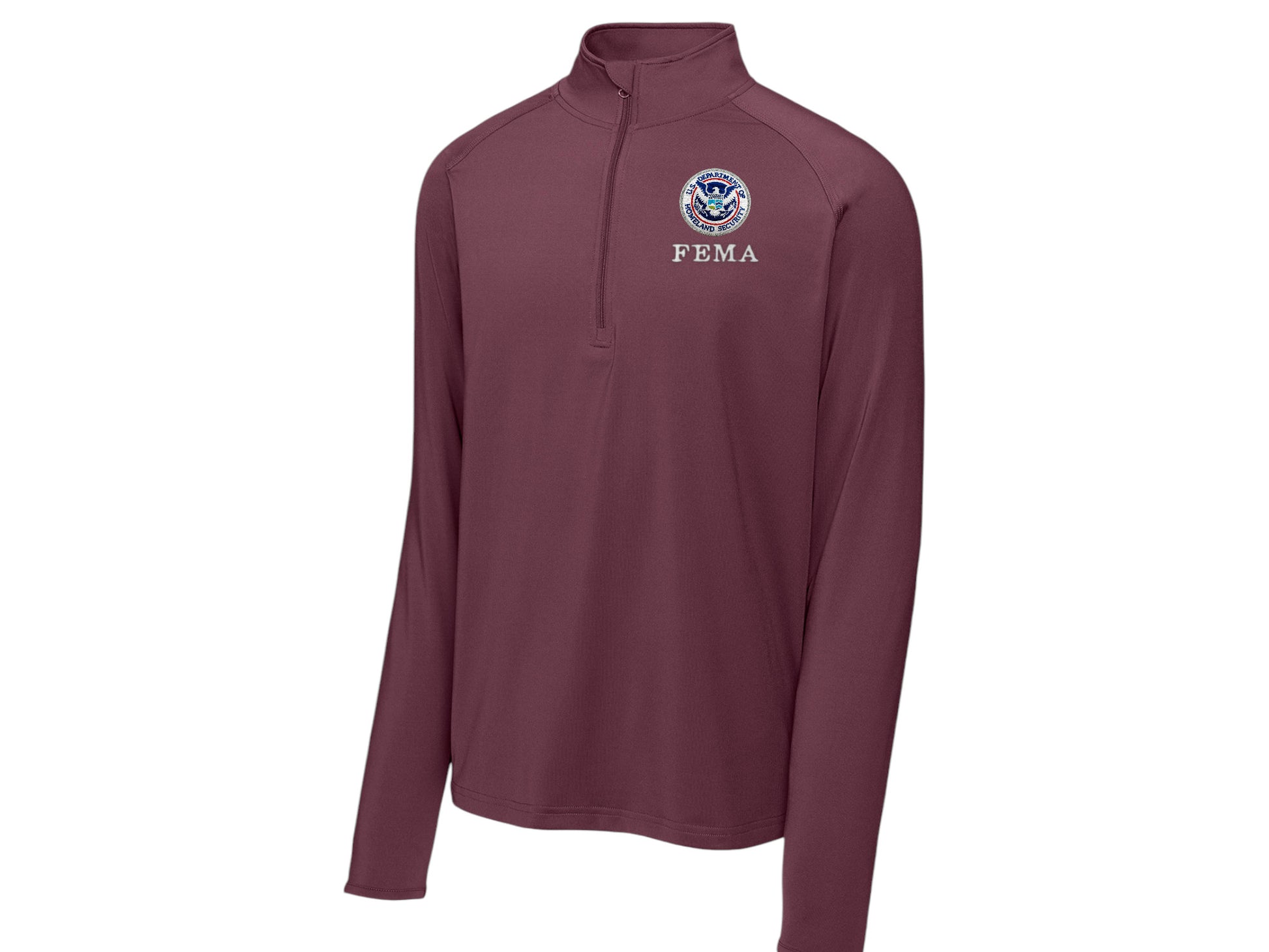 SPORT TEK SPORT WICK STRETCH 1/2 ZIP PULLOVER IS EMBROIDERED DHS SEAL WITH FEMA UNDER THE SEAL ON LEFT BREAST. OPTIONAL NAME AND/OR CUSTOM TEXT CAN BE APPLIED.