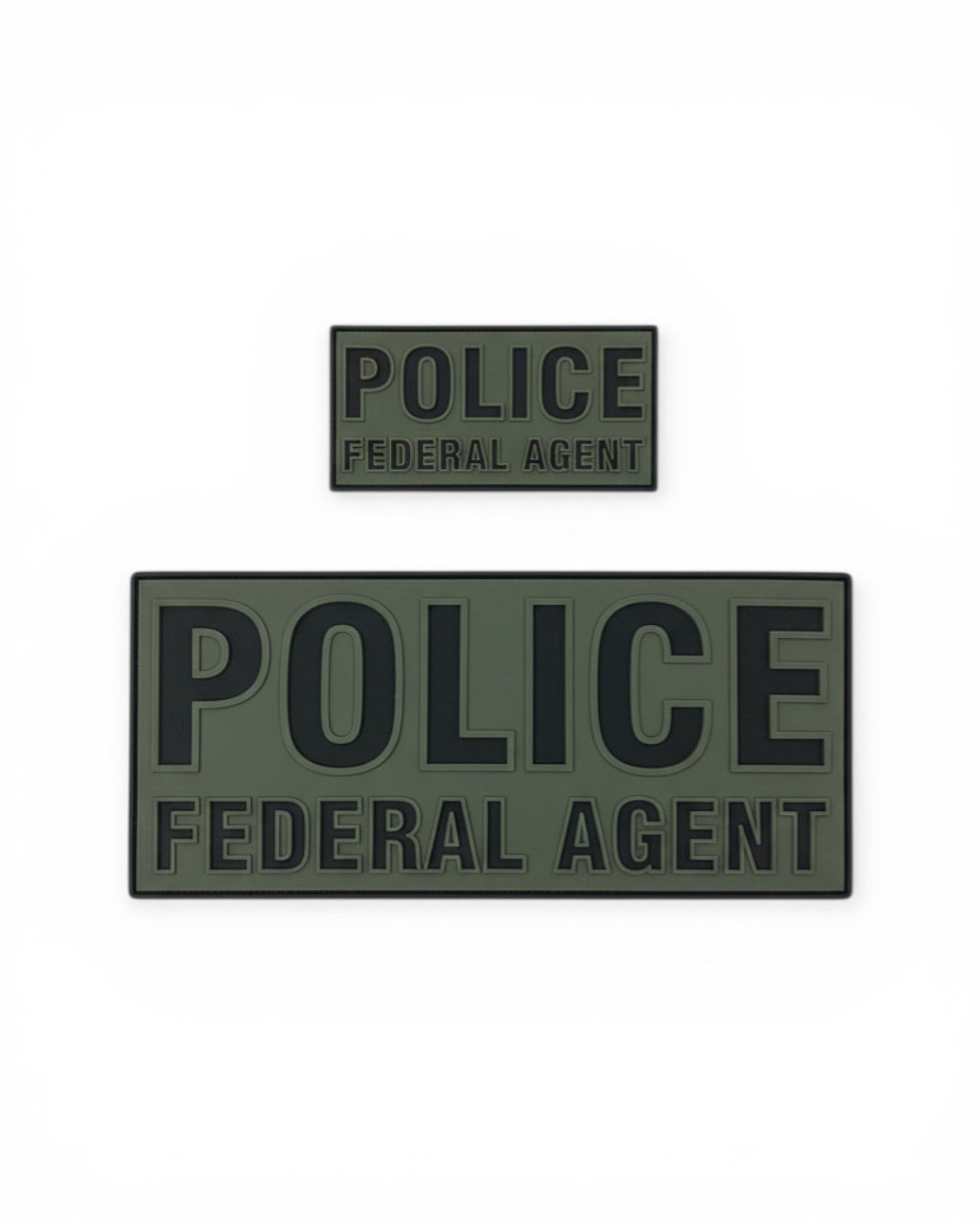 “POLICE FEDERAL AGENT” in bold, raised lettering, contrasting lettering giving them a low-visibility, professional appearance. Designed in two sizes, they have a durable, rubberized (PVC-style) construction with clean edges and a structured look, making them suitable for tactical vests, plate carriers, uniforms, or gear bags where clear identification is required while maintaining a muted color profile.