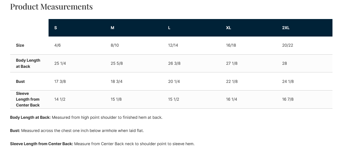 - Body Length at Back: Measured from high point shoulder to finished hem at back.