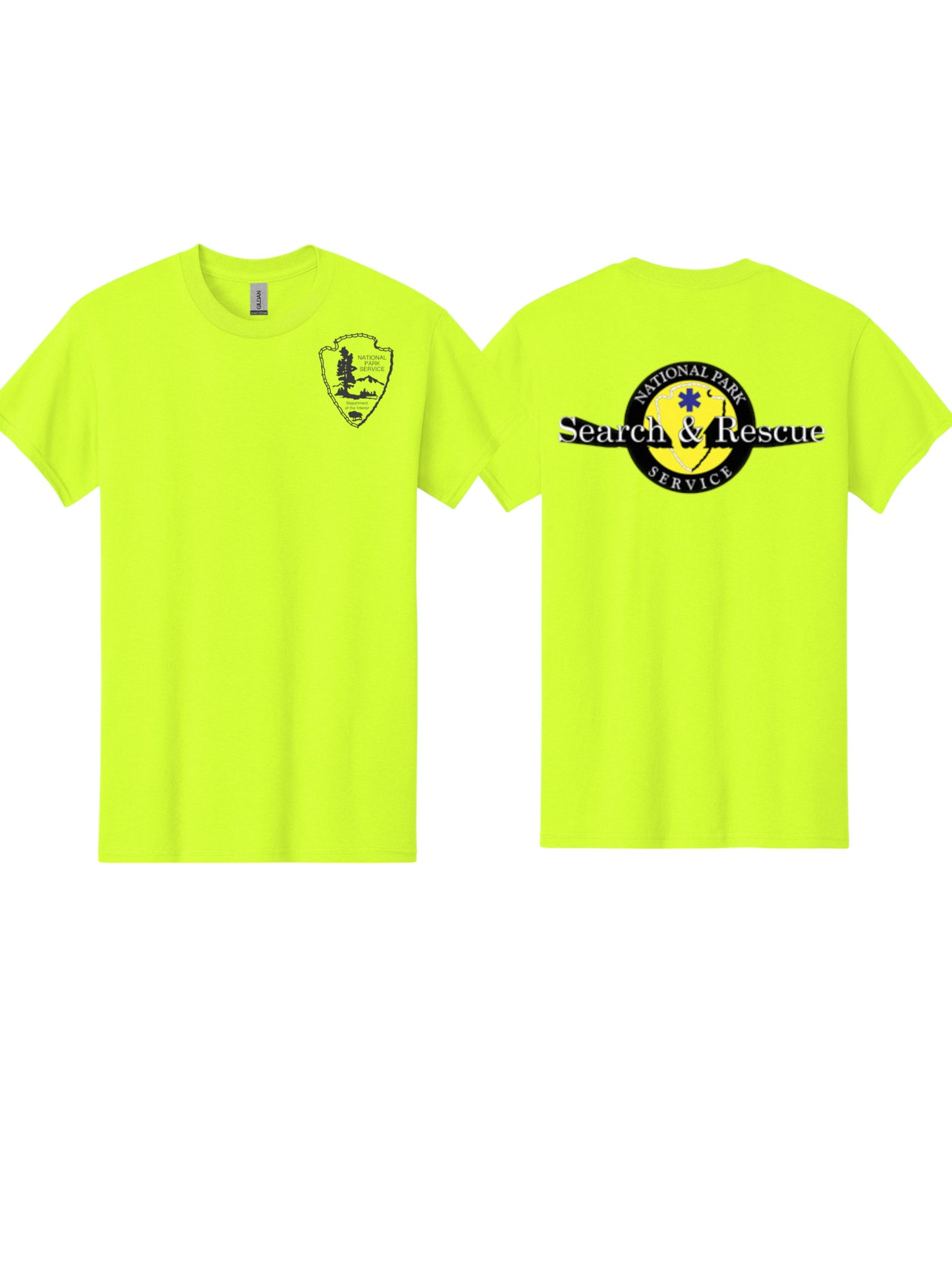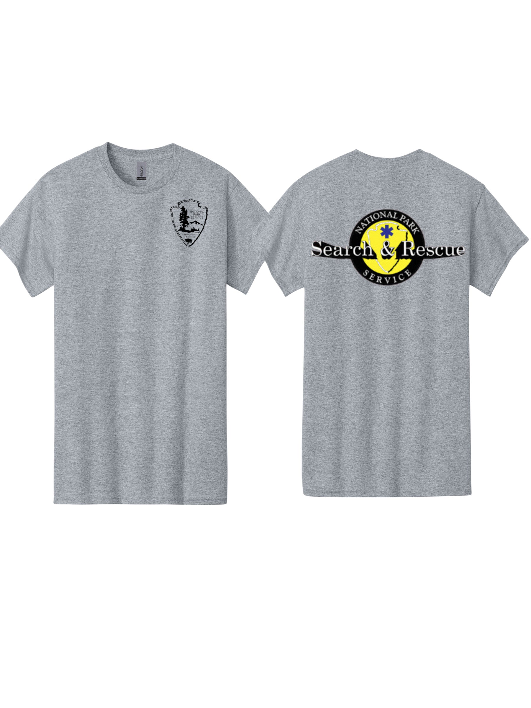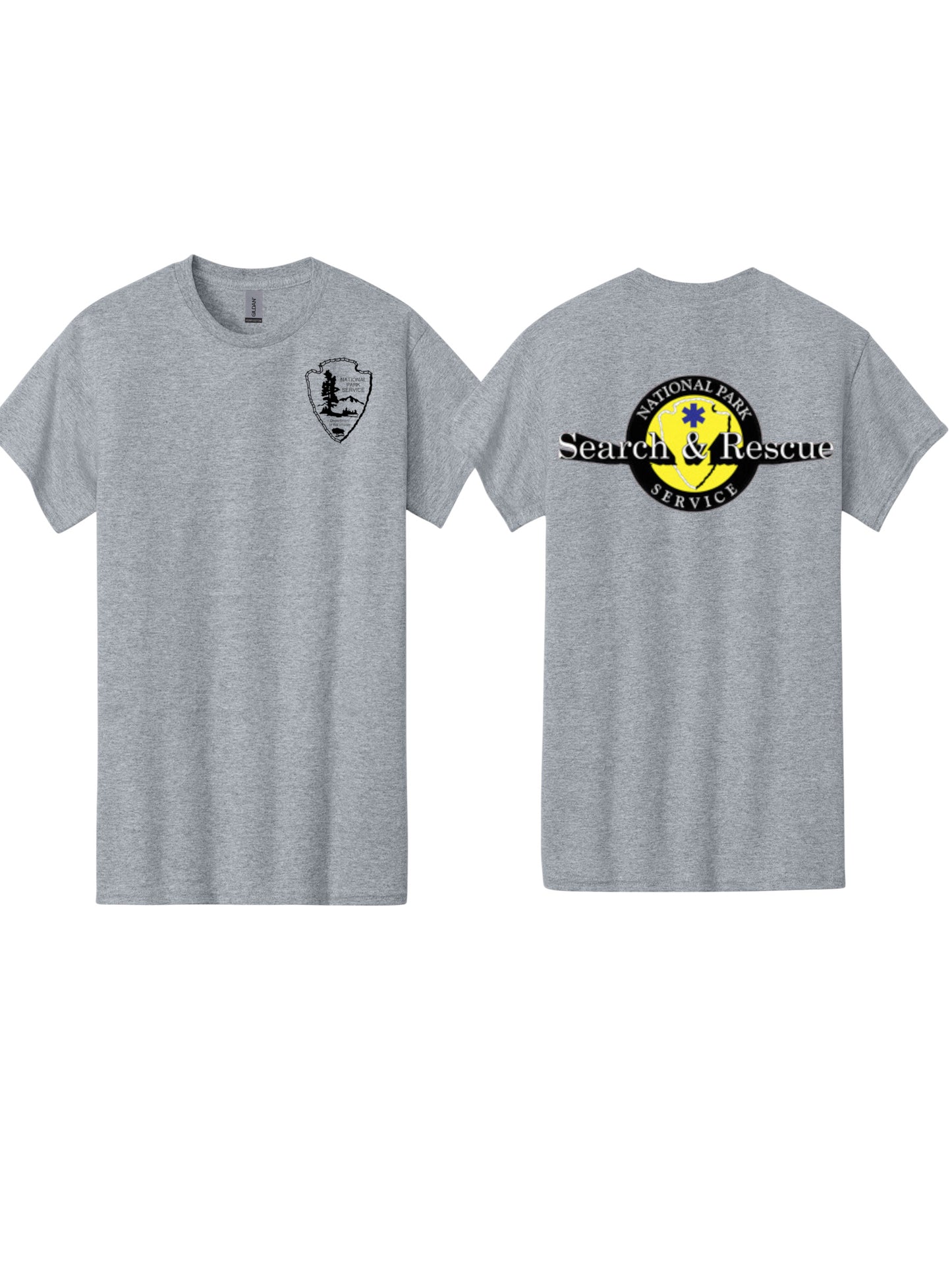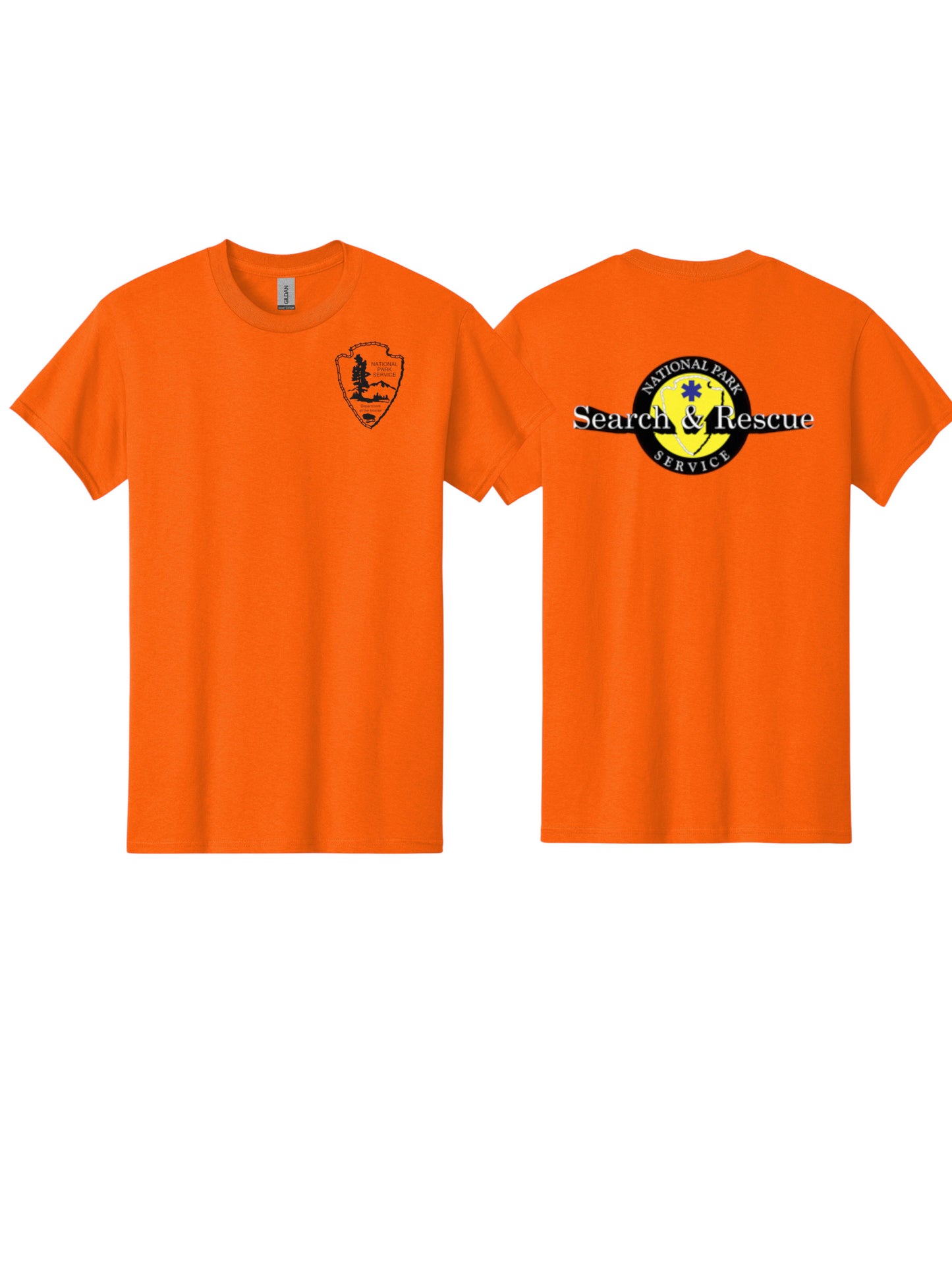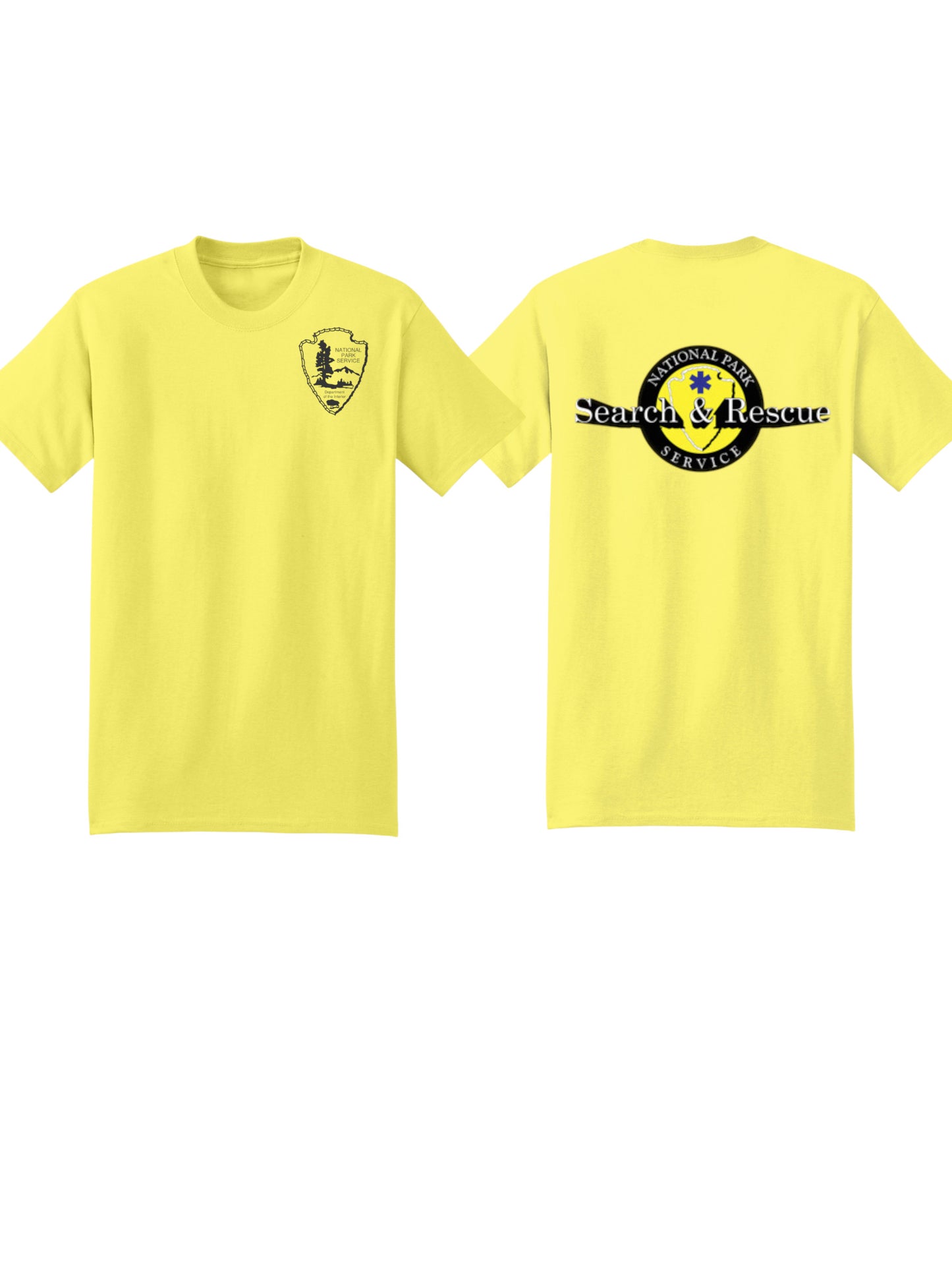 NPS ARROWHEAD ON FRONT LEFT CHEST AND NPS SEARCH AND RESCUE LOGO ON THE BACK.