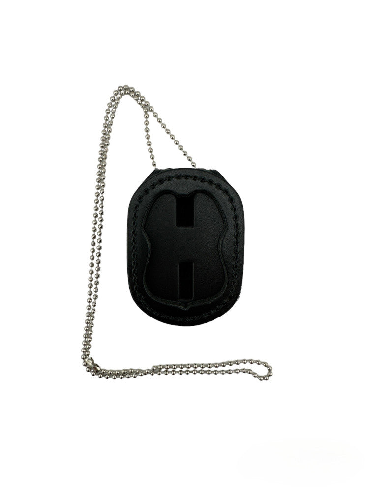 BELT BADGE CLIP THAT FITS THE POSTAL INSPECTOR BADGE. THE LEATHER IS DOUBLE THICK SO THAT THE BADGE SITS COMPLETELY RECESSED IN THE CLIP. IT COMES WITH A CHAIN TO WEAR AROUND THE NECK AND HOOK AND LOOP CLOSURE.