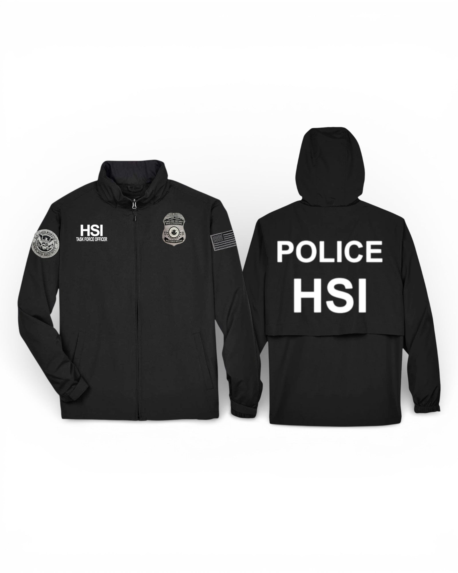 NORTH END BRAND JACKET WITH HSI TASK FORCE BADGE EMBROIDERED ON FRONT HSI TASK FORCE OFFICER PRINTED IN WHITE ON RIGHT CHEST FLAG SEWN ON LEFT SLEEVE DHS SEAL SEWN ON RIGHT SLEEVE AND POLICE HSI PRINTED ON BACK IN WHITE.